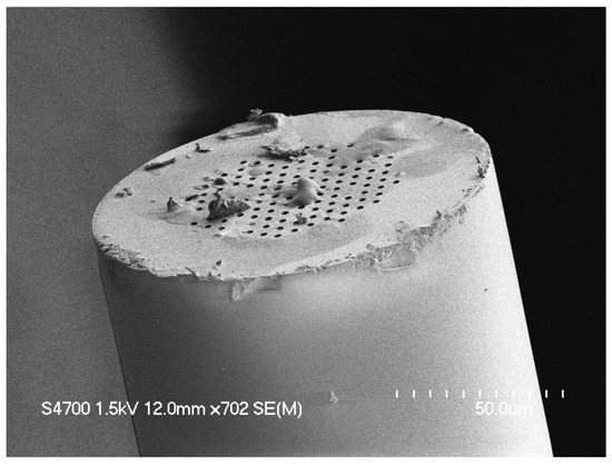 SEM image of a PCF face after conventional cleaving with small defects affected some of the holes of the fiber. Small defects as pictured here can be difficult to see under a standard light microscope during faster quality assurance [24].