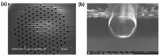 Test six from Figure 7 was shown to be the ideal set of laser-cleaving parameters. Test four’s slow stage speed created a thick redeposited silica layer. Test five’s RF power was too strong, resulting in a significant surface defect of the PCF’s tip. While the PCF tip may look great under an SEM, there still existed a layer of redeposited silica over the microchannels. Next, a PFIB (model: ThermoFisher Helios G4) with a xenon ion source was used to mill down 0.2 mm–0.3 mm of the surface of the PCF to remove this redeposited silica layer and open up the microchannel holes. The PCFs were secured inside the PFIB using copper tape. The PFIB was set to the following parameters: electron voltage of 30 kV and a source current of 2.5 μA. The final result can be seen in Figure 5b.