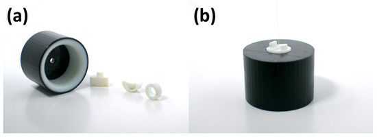 (a) Individual components of the 3D-printed pressure adapter. (b) Assembled components of the 3D-printed pressure adapter with a PCF attached. This could then be inserted onto the neck of a flask.