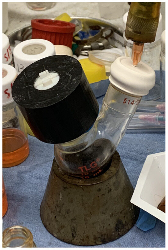 In order to use this pressure adapter, we first added in anywhere from one to three PCFs on one of the rubber clamps that was over a rubber o-ring. These PCFs were pushed through the hole in the pressure adapter. Then, a second rubber clamp was carefully slid onto the pressure adapter in order to make a seal. The pressure adapter was then slid into the top neck of the flask. The second neck of the flask had 5 SLPM of positive pressure applied using a syringe piercing through a septum on the neck of the flask. Super glue was used to create an airtight seal around the syringe. The tip of the PCF fiber was submerged into the colloidal magnetite nanoparticle solution on top of a non-magnetic surface. If this were non-magnetic nanoparticles, the magnetism of the surface would not matter. Fun-tak was used to create a better seal between the pressure adapter and the flask. Even with 3D-printed rubber creating a friction fit seal around the neck of the flask, some air could still leak through. If the rubber seal was made to be too narrow, it risked breaking the flask. Thus, Fun-tak was useful in creating a seal and avoiding accidentally breaking the neck of the flask, which could create safety concerns in a laboratory setting. An example of this setup can be seen in Figure 11.