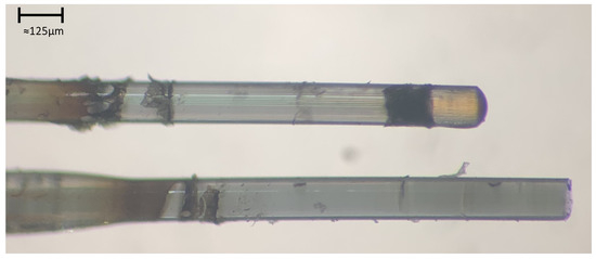 Conventional cleaving of a PCF using a scoring blade is not the most reliable technique and does not result in the best surface finish (some defects are left behind) [24]. This paper shows a new process that guarantees a well-cut fiber tip every time (smooth surface finish and all holes open) and relatively easy to scale. It uses a femtosecond pulsed laser (model: Coherent Monaco 1035, Coherent, Inc., Santa Clara, CA, USA) to cut through the fiber with a beam diameter of ≈20 μm after being focused through a 5× microscope objective. This diameter was confirmed with a burn test on a piece of copper. This was followed by a plasma-focused ion beam (PFIB) (ThermoFisher Helios G4, Thermo Fisher Scientific, Waltham, MA, USA) Xe ion source to clean off the surface of the fiber tip of redeposited glass. We termed this novel process as the laser-cleaving plasma-cleaning (LCPC) method. Femtosecond pulsed lasers have inherent issues when it comes to precision cutting at the micrometer scale. As the laser interacts with the surface it is ablating, it produces a plasma plume that contains heated material. This heated material can redeposit itself along the surface the laser is cutting through. This is problematic for PCFs, which have fine microchannels that need to be clear in order to allow for the drawing of nanoparticles. Hence, this redeposited glass needs to be cleared away. An example of this redeposition of material can be seen under a microscope in Figure 4.