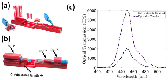 (a) The 3D-printed part with no clamps applied. (b) Fiber connectors with PCF in the structure with clamps applied. (c) Shows optical transmission before and after applying the correct pressure on the PCF fiber with the adjustable connector.