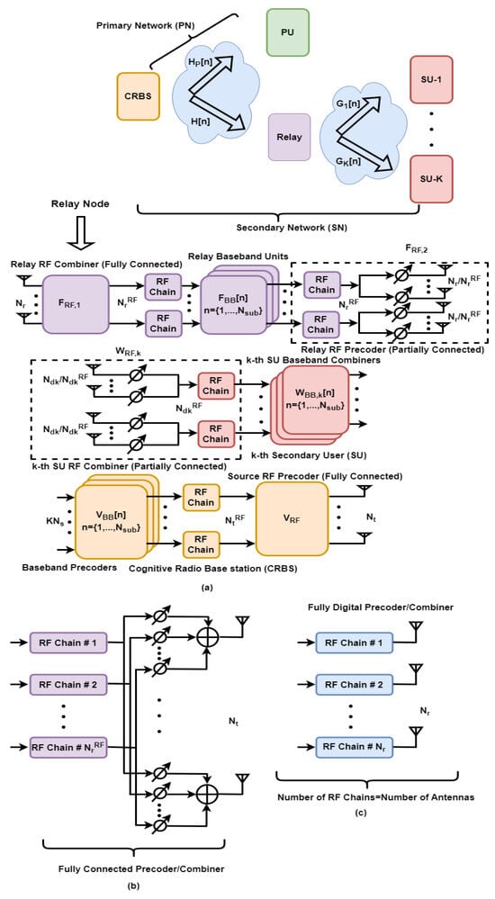 (a) System block diagram of a mixed-structure cognitive radio hybrid wideband transceiver in mm-wave relay-assisted MU-MIMO networks, (b) Fully Connected Structure, (c) Fully Digital system.
