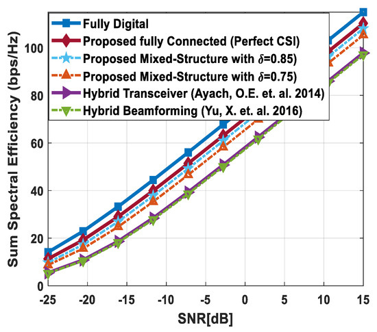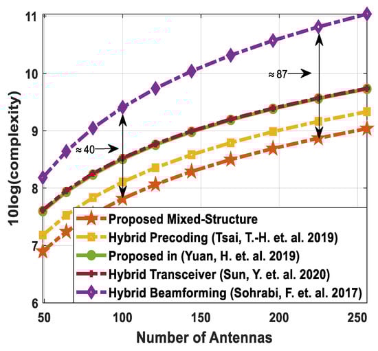 Future wideband mobile wireless networks need to accommodate the explosively growing demand for ultra-high-speed data transmission. This requirement leads to the exploration of the millimeter-wave (mm-wave) frequency band (30–300 GHz), owing to its advantage of containing huge spectral resources [1]. Furthermore, mm-wave technology with large-scale multi-input multi-output (MIMO) (also referred to as massive MIMO) systems are two key findings to address the spectrum crunch and enhance spectral and energy efficiencies [2]. Therefore, it is possible to realize several newly emerging applications, such as smart environments, autonomous vehicles, industrial and agriculture automation, remote healthcare, high-quality three-dimensional (3D) video, holographic imaging, virtual reality, and augmented reality [3,4]. These applications essentially demand low latency, higher data rates, and enhanced connectivity. Additionally, innovative signal processing techniques are required to make mm-wave communication feasible on commercial grounds [5]. There are several reasons behind that, such as new hardware constraints, operations at higher frequencies and large bandwidths, mm-wave channel impairments, advanced circuit implementation, and power consumption challenges to deploy large-scale antenna arrays to attain high beamforming gain [6].