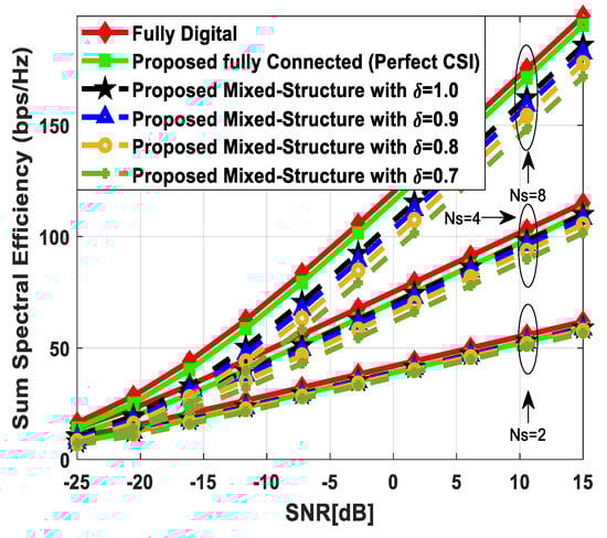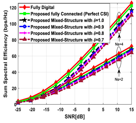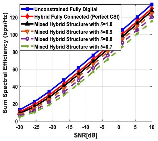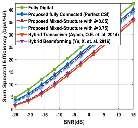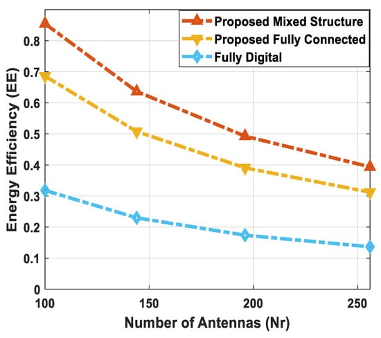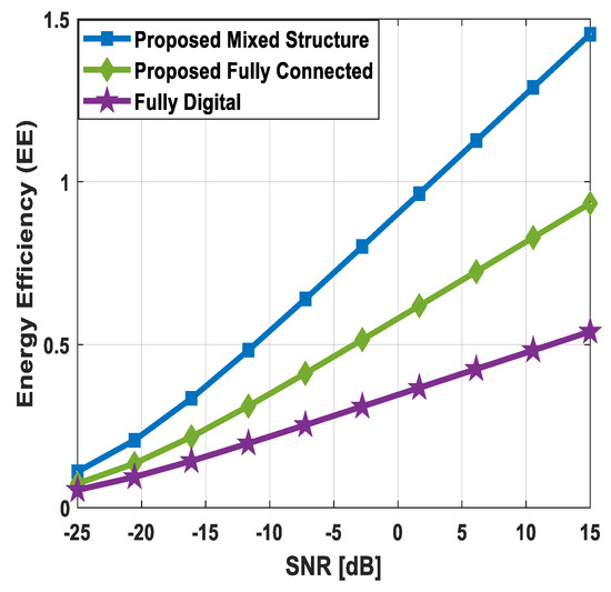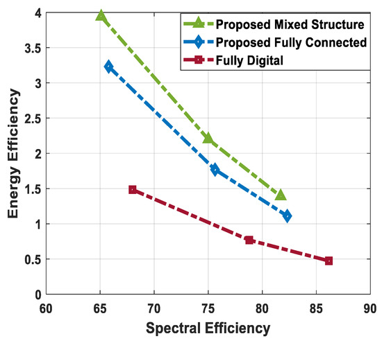 - Numerical results are generated by changing system parameters over a wide range for both mixed and fully connected structures. Also, the performance curves are obtained under imperfect channel state information (CSI), considering the mixed hybrid architecture. It is evident from the simulation results that the suggested fully connected structure achieves performance close to full-complexity digital precoding, while the mixed hybrid structure shows relatively lower performance compared to the fully connected one. Furthermore, minor degradation in performance occurs when channel estimation error increases gradually. The obtained results also show that the proposed mixed architecture achieves significantly higher energy efficiency when compared to its fully connected counterpart. Finally, the achieved spectral efficiency and energy efficiency demonstrate the effectiveness of the proposed approach.