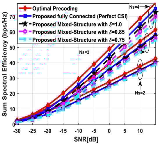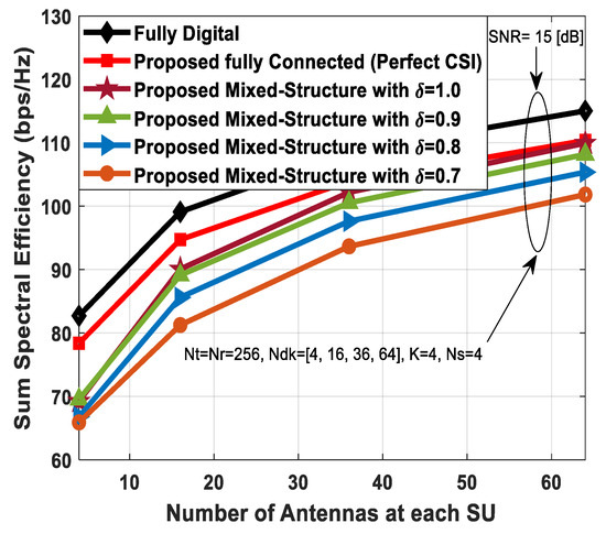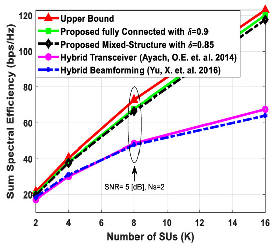 Figure 21 illustrates the spectral efficiency performance of the proposed approach, considering UCA at the source and relay nodes, while a uniform linear array (ULA) is deployed at each SU. The optimal fully digital beamforming is considered as the baseline for comparison. The number of antennas and the number of data streams are set as follows: , , , and . It is evident from the obtained results that the fully connected structure obtains approximately 83% of the optimal value, while the mixed architecture achieves nearly 76% of the baseline.