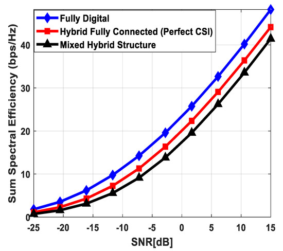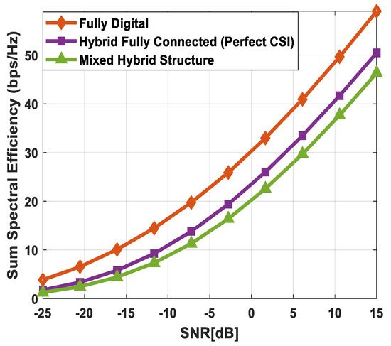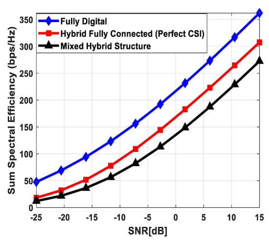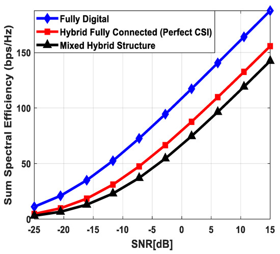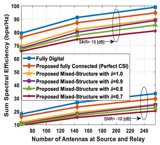 In [53,54], the authors investigate relay-assisted hybrid precoding for maximizing spectral efficiency in single-user and MU mm-wave massive MIMO networks with a fully connected structure. Moreover, the amplify-and-forward (AF) relaying protocol is considered at the relay station in these designs. The works in [55,56] also focus on relay-based hybrid beamforming for maximizing energy efficiency in single-user mm-wave large-scale MIMO systems using partially connected structures at communicating nodes. Specifically, iterative successive approximation (ISA) and alternating direction method of multiplier (ADMM) algorithms are used to achieve the desired goals in [50,55], respectively. In [57], the authors examine the hybrid transceiver for multi-hop AF relay systems by taking channel errors into account. A mixed hybrid architecture, comprising both partially connected and fully connected structures, is proposed in [58] based on matrix factorization to achieve near-optimal performance. This hybrid precoding strategy shows lower hardware complexity and higher energy efficiency when compared with the corresponding fully connected structure. The authors of [59] present a codebook-based generalized sub-array connected (GSAC) structure for hybrid transceiver design to enhance energy efficiency. The authors in [60] design an analog beamformer that aims to minimize the channel estimation error by leveraging the channel’s long-term properties. Then, the baseband processing matrix is computed by employing simple digital signal processing such as maximum ratio combining/maximum ratio transmission (MRC/MRT). In [61], hybrid beamforming for mm-wave MIMO relay networks is suggested using imperfect CSI, where the AF protocol is adopted at relay nodes. Moreover, both algorithms [60,61] consider fully connected hybrid structures.