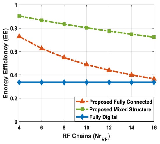 - Gao, H.; Liu, D.; Zhang, Z. Energy Efficiency Maximization for Partially-Connected Hybrid Beamforming Architecture with Low-Resolution DACs. IEEE Trans. Commun. 2024, 34, 998–1009. [Google Scholar] [CrossRef]