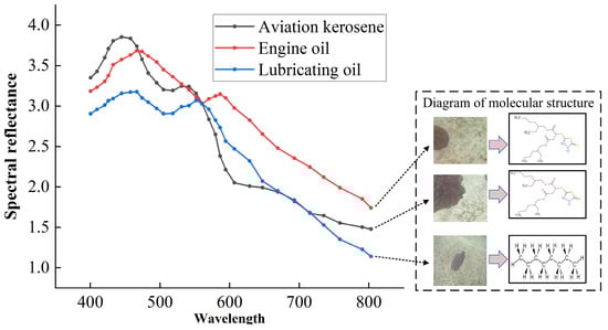 Oil spillage on airport pavement is a prevalent issue and predominantly comprises aviation kerosene, motor oil, lubricants, and similar substances. These oil contaminants often exhibit strikingly similar colors when captured in RGB images, posing challenges for accurate detection based on traditional visual inspection and detection methods and effective cleanup. However, it is worth noting that different types of oil spills exhibit varying levels of reflectivity. This fundamental insight forms the theoretical basis for leveraging multispectral images in the detection of oil spills on airport pavement. In a study conducted by Lai, X. [15], the authors conducted extensive testing and analysis on oil spills including paraffin, motor oil, and lubricating oil in oceanic environments. The results revealed discernible differences in the reflectance properties of various oil spill types, as depicted in Figure 1 below.