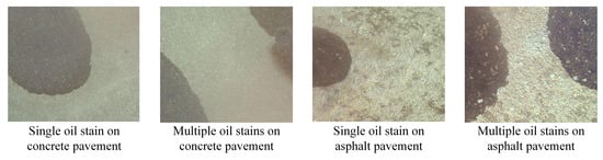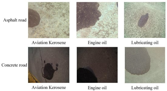 The dataset utilized in this study was collected from an airport located in Shanxi, China, and encompassed a diverse range of samples representing airport runway oil spills, including instances of aviation paraffin, motor oil, and lubricants. To optimize the reconstruction speed and accuracy of RGB images depicting oil spills on airport pavement, the data acquisition process was specifically conducted during periods of clear weather conditions. To account for the intricate nature of airport runway oil spillage, the dataset was further enriched by incorporating a mixture of aviation paraffin, motor oil, and lubricating oil, thereby encompassing a comprehensive representation of oil spill types commonly encountered on airport runways. Furthermore, given the varied composition of airport pavement, separate datasets were created for both asphalt and concrete surfaces, ensuring a comprehensive coverage of diverse pavement materials. Figure 2 provides a visual representation of some selected samples from the dataset, offering a glimpse into its richness and diversity.