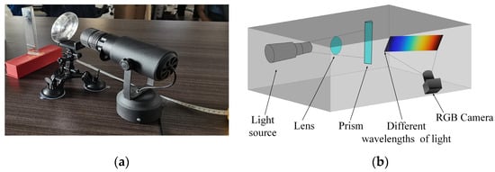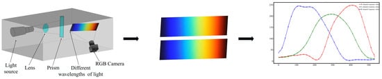 The experimental system platform developed in this study is depicted in Figure 3, with Figure 3a showcasing the components and arrangement. The platform comprised essential elements such as a standardized light source, a convex lens, a prism, and an RGB camera, which collectively facilitate the acquisition of spectral images. The experimental process for acquiring these spectral images is illustrated in Figure 3b. Notably, the spectral acquisition procedure necessitates a controlled environment within a dark room to minimize external light interference and ensure accurate and reliable results. Meticulously maintaining a dark room environment during the spectral acquisition process was crucial to the success of this study.