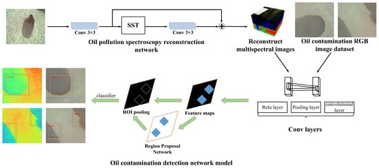 Schematic diagram of oil spectral reconstruction and oil detection network architecture.