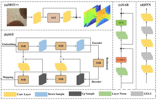 Nonetheless, employing the Transformer model directly for spectral reconstruction presents certain challenges. Firstly, the multi-head self-attention (MSA) mechanism entails high computational complexity. Secondly, MSA is constrained by the input sequence length [25]. To address these issues, this study introduces the Multilevel Spectral Smart Transformer model (MST++) based on the Transformer framework [26]. The model structure is shown in Figure 6. Leveraging the sparse spatial distribution and self-similarity of multispectral image signals, the proposed approach incorporates a spectral-level self-attention mechanism (S-MSA) as a fundamental unit known as the spectral-level self-attention block (SAB). This mechanism efficiently reconstructs spectral information from RGB images. Furthermore, by integrating a spectral-level autonomous block, a single-stage spectral-level Transformer (SST) is constructed. The SST represents the input RGB image as a three-dimensional tensor and decomposes it into spectral and spatial dimensions. The structure of the SST follows a U-shaped architecture, featuring an encoder and a decoder, with both comprising multiple spectral-level self-attentive blocks (SABs), where the former extracts spectral information from the RGB image and the latter reconstructs the extracted spectral information into a multispectral image. Finally, the MST++ model is composed of multiple SSTs, working jointly to improve the spectral reconstruction process.