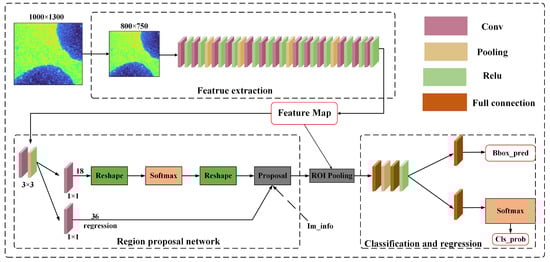 In this study, we employed the Faster RCNN algorithm, a deep learning-based approach, for the detection of oil spills in multispectral images of airport environments. Faster RCNN comprises four core modules: Feature Extraction Network, Region Proposal Network (RPN), Generation of Region of Interest (ROI), and Classification and Regression [27]. The Feature Extraction Network module is responsible for extracting relevant features from the input image by employing convolutional, ReLU activation, and pooling layers, which collectively capture high-level representations of the input image. The Region Proposal Network generates multiple Regions of Interest (ROIs) based on the extracted feature map. Each candidate region is assigned a probability value and is subsequently classified by a classifier. The Generation of the ROI module takes the output regions from the RPN and the feature maps from the Feature Extraction Network as input. It combines the region features from both sources and feeds them to a fully connected network for classification. The Classification and Regression module takes all the feature maps as input and outputs both the object category and its position within the image. This module employs bounding boxes to refine the object’s position, improving localization accuracy. Figure 7 illustrates the architecture of Faster RCNN, showcasing the interconnectedness of its components.