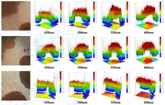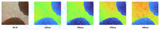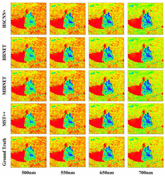 To provide a more intuitive demonstration of the different effects of each network model on spectral reconstruction and to validate the performance of MST++, we randomly selected an image from the validation set to showcase the reconstruction results. This approach ensured an unbiased evaluation of the model’s generalization ability and its effectiveness in reconstructing spectral information on images not used during training. The reconstruction results are presented in Figure 8. Specifically, four wavelengths, namely, 500 nm, 550 nm, 650 nm, and 700 nm, were chosen to display the multispectral reconstruction outcomes. These wavelengths cover the visible and near-infrared spectra, allowing for a comprehensive assessment of the model’s performance in reconstructing features across different spectral regions [35,36]. The last row shows the ground-truth spectral images for comparison and verification.