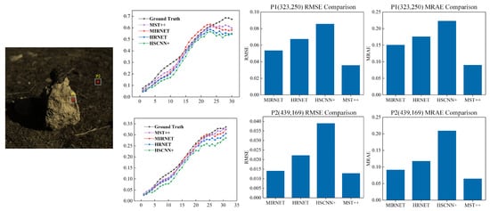 To further demonstrate the model’s reconstruction performance on different objects within the same image, we selected two validation points: one from the main subject area (Position 1, coordinates 323, 250) and another from the background region (Position 2, coordinates 439, 169), representing areas with distinct spectral characteristics. By randomly selecting validation points from both the subject and background for analysis, we aimed to showcase the model’s ability to reconstruct objects with varying spectral features within an image. This provides a detailed visualization of the MST++ spectral reconstruction network model’s performance in preserving the spectral information of various objects. As illustrated in Figure 9, a comparison of the pixel-level reconstruction performed by the MST++ model and three other reconstruction models for the selected image and validation points is presented. The MST++ results exhibit a closer resemblance to the ground-truth spectral images compared with the results of the other three models. This demonstrates the superior performance of MST++ in accurately reconstructing spectral information at the pixel level, both for the main subject area and the background region.