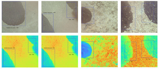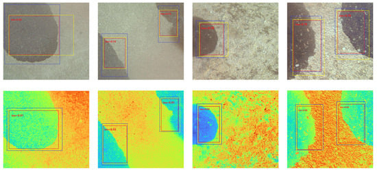 In Figure 14, the yellow border represents the position of the real target box, which was obtained from the labeled data, while the blue border indicates the position of the predicted target box detected by the RGB image target model. The red border represents the overlap between these two target boxes. The results presented in Figure 14 clearly demonstrate the model’s ability to accurately detect the position of oil spills in the images. The red border, representing the overlap between the predicted and real target boxes, indicates a high degree of alignment. This alignment validates the effectiveness of the detection model in precisely identifying the location of the oil spills in the images. The findings illustrated in Figure 14 provide strong evidence of the detection model’s capability to reliably detect and locate oil spills. This information is crucial to implementing appropriate measures to address and mitigate oil spills on airport pavement.