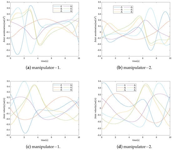 where denotes the friction torques. Equation (52a) describes a linear friction model. Equation (52b) describes a nonlinear friction model. In Equation (52b), indicates the coefficient of viscous friction, is the Coulomb friction factor, and are used to construct the Stribeck friction action, and ensures that the equation is continuous when the relative sliding velocity is zero [44]. The exact inertial parameters of the robotic arm are difficult to obtain accurately, and even if they are obtained through software calculations, they can be biased during the assembly process. Therefore, the mass of the robotic arm linkage was adjusted to (kg), (kg), (kg), (kg), (kg), and (kg). The center of mass of the linkage of the robotic arm was adjusted to be , , . If the robotic arms are handling a flexible object or a liquid container, then the center of mass of the target object will also change. This causes the end loads to transform. With the help of the GJM, load perturbation variation can be translated into the robot joint space and considered as joint disturbance torques. The disturbance torques are assumed as follows: