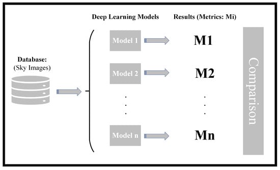 As outlined, the first step involved creating a database comprising images depicting various sky conditions for the study. During this process, the samples were labeled according to different types of cloud cover. Once the database was established, various classification models were implemented. Subsequently, the samples were fed into these models for classification. The classification results were then assessed using different metrics to evaluate the performance of each implemented model. Finally, a comparison of the different models utilized in this study was conducted, based on the outcomes reflected by these model evaluation metrics.
