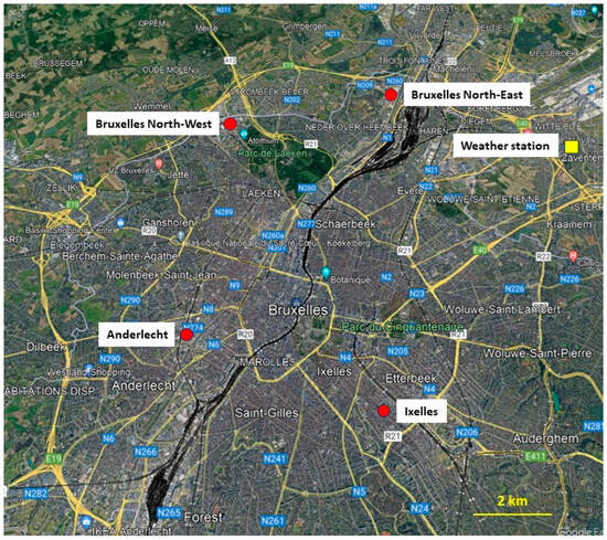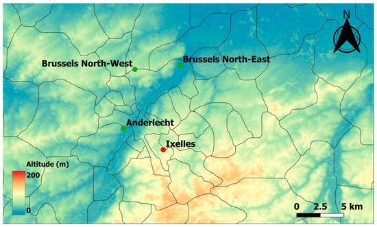 As shown in Figure 1, the Ixelles site is in the middle of high-density urban houses and buildings, with forests and parks at several km in the south/south-east direction, indeed not exactly under the main wind directions. On the other hand, the Brussels North-East station is located at 3 km from a main park (Laeken Park), which is in the south-west direction of the measurement site and thus under the main wind direction (Figure 8). There are also crop fields at 2 km in the west north-west direction, under the main wind directions. The Brussels North-West station is close to the Laeken Park, but the park is in the opposite of the main wind directions and at a lower altitude than the sensor’s location. However, crop fields are present less than 2 km away with a partial exposure to the main wind directions. Finally, the Anderlecht site is in-between these situations, with some small parks 2 km away and agricultural fields at about 4 km in the west direction, under the main wind directions.