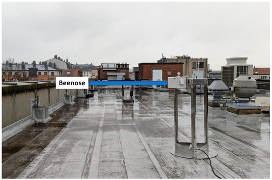 The experimental setup at Ixelles aims at evaluating the Beenose sensor performances. For this inter-comparison with the Hirst-type trap, both instruments were placed on the same building rooftop at a height of 14 m above ground level, 1.5 m above the rooftop level (Figure 2), and around 15 m from each other.