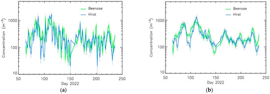 The daily evolution of log-scaled average total pollen concentrations provided by the two instruments is shown in Figure 3a. Overall, the Beenose sensor is in line with the Hirst-type trap for both low and high total pollen concentration values, typically from 10 to 1000 particules·m−3, showing the same variations even if the former is limited by the counting saturation for high concentrations. A sliding smoothing filter of 5 days was applied for visual validation, showing that the Beenose instrument has well captured the main temporal evolution of the pollinic content provided by the Hirst sensor (Figure 3b). The annual pollen integral shows a mean error of 13% for the entire season. In case of perfect agreement, the correlation coefficients must be equal to 1; values greater than 0.5 indicate a good correlation. The good agreement between the two sensors’ measurements is confirmed by the similarity and the high values of the correlation coefficients: Spearman correlation coefficient of 0.71 and Pearson correlation coefficient of 0.72 (although the variables do not come from a perfect normal distribution). The values for the two correlation coefficients is above 0.80 when considering the 5-day average smoothing, used to remove the daily fluctuation from the main temporal tendency. These correlation values are similar to those obtained by other automated sensors [22].