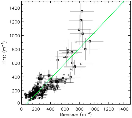 The correlation plot (Figure 4) between the two sets of measurements shows a relationship close to 1 with an origin close to zero and overlapping error bars in most of the cases. The three highest values from Hirst measurements that are underestimated by Beenose are likely due to the saturation effect of this instrument. These results confirm the ability of Beenose to be used for the present scientific analysis of the pollen content. Obviously, other comparative studies should be conducted in the future for different locations and different taxa.