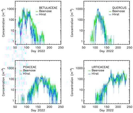 Regarding the inter-comparison of concentrations for specific pollen species, six taxa were selected: Betula (birch), Alnus (alder), Corylus (hazel), Quercus (oak), Poaceae (grasses), and Urticaceae (nettles). Our study is limited to these species as they were the most critical and/or abundant ones during the studied seasons in the Brussels area among those detected by Beenose. Note that the first three taxa were grouped into one category as they belong to the same family (i.e., Betulaceae).