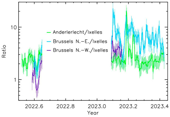 Considering the proximity of the sources, the main wind direction and the sensor elevations, some spatial trends could be qualitatively proposed. The concentrations in urban conditions (Ixelles) relatively far from the sources of emission or not under the main wind directions are always lower than those closer to the sources (Figure 6), even with distances of only a few kilometers. During the grass season (summer 2022), the three other sites compared to Ixelles exhibit relatively similar values. The situation is different when pollens originate from trees (here, the first part of 2023). Although the values are still often the lowest ones for the Ixelles sensor, the Brussels North-East sensor, downwind of a main park, exhibits the highest level of pollen concentrations. The two other sites (Anderlecht and Brussels North-West) located in areas with a moderate presence of trees exhibit lower values. Note that the short-time variabilities of the ratios over a few days at the beginning of March could be due to changes in the winds’ strengths and directions. This first analysis shows the spatial variability in pollen content to which the citizens are exposed.