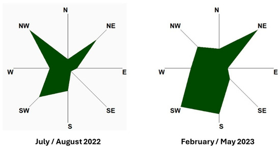 The meteorological data from the Zaventem weather station (50°53′ N, 4°28′ E), close to the Brussels airport and at 8 km from the center of Brussels in the north-east direction, are used to evaluate the effect of the wind on the pollens’ transport. For the two periods, the winds are mainly coming from the south to the north-west direction during the summer of 2022 (thus from the North Sea), and of less importance from the north-east direction (Figure 7).