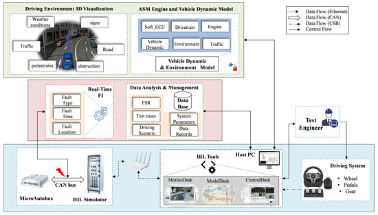 Today’s software-driven automotive systems are considered heterogeneous and complex, and have a high degree of functional interdependencies [1]. The emergence of intelligent assistance functions, such as Advanced Driver Assistance Systems (ADASs) [2], has increased the complexity of the system architecture. In a modern vehicle, the system architecture includes up to 120 ECUs communicating over more than five system buses and exchanging 2 million messages per minute [3,4]. Testing such complex systems against functional and non-functional requirements is therefore a challenge in the industry. In addition, automotive safety systems in particular must be rigorously verified and validated according to the functional safety standard ISO 26262 [5]. In the development cycle of ISO 26262, different test levels are defined, i.e., unit test, integration test and system test [6]. It also provides requirements and recommendations for the development process to ensure the functional safety of the developed systems.