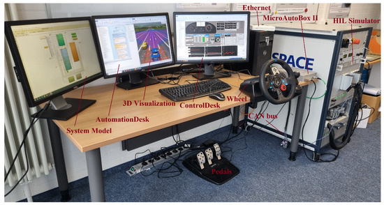 Real Logitech steering wheel, gearshift and pedals are used for manual driving. The driving elements are connected to the host PC via USB communication protocol. Before the driving elements are connected to the HIL system, the PC is used for setup and configuration to define the devices. After setup and configuration, the driving system is connected to the HIL simulation via the ControlDesk tool, which connects the software steering controller to the real physical steering wheel. By using the aforementioned controller, not only can the variable values of the device be adjusted, but also its range can be calibrated according to the experimental requirements. Once the steering device is connected, the calibration process with the real-time simulator takes place. In this phase, the “Angle of Steering” variable is manually calibrated to match the 3D virtual driving environment; in this study, the range is specified to be [300–300]. Next, the pedal variables, i.e., Pos_ACC, Pos Brake and Pos_Clutch are connected and calibrated according to the acceleration, braking and clutch position with a range of [0–100]. Finally, the gear variables are set in ControlDesk so that each gear level is set to a specific number as an on/off button in the steering controller. During the manual test drive, the driving commands are received from the driving system as external inputs to the systems according to the user’s actions. Then, in online mode, the vehicle system executes the driving scenario during real-time simulation, taking into account the user’s driving commands.