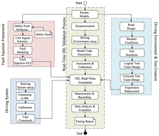 Recently, HIL simulation has been introduced as the best solution to the aforementioned method issues, i.e., the time constraints and the complexity of the real vehicle prototype. HIL is characterized by high reliability and flexibility of the test environment, as well as low cost and time. The ability to execute the generated code of the control and plant model in real time allows comprehensive system behavior to be accurately captured and simulated. Moreover, critical scenarios and failures can be investigated without compromising the safety of the test engineer. In addition to the reproduced and automated test process, real physical components, e.g., sensors, actuators and steering system, can be connected to HIL to enable reliable validation at an early stage before production. In addition, FI based on HIL simulation paved the way for efficient system-level validation of functional safety in critical edge cases according to the ISO 26262 standard [27].