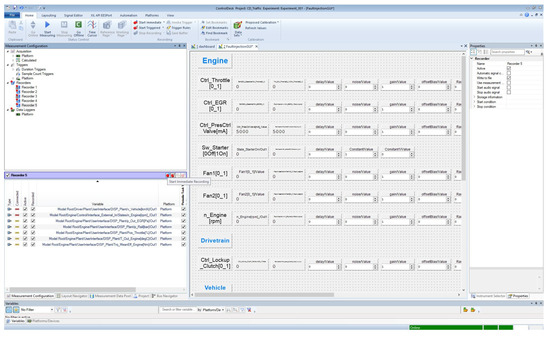 Thanks to the FI GUI (Figure 5), FI experiment configurations can be modified and specified by the user before and during real-time execution according to the test requirements and objectives. It is worth mentioning that the developed framework allows injecting faults individually or simultaneously. The majority of the critical system components were covered in this study, including various vehicle subsystems, such as the engine, vehicle dynamics and powertrain. Furthermore, it supports the analysis of the effect of transient and permanent faults on the system behavior in real time. Finally, two execution modes are provided by the framework, i.e., automated and manual execution. If the test drive is performed automatically by the machine, the faults can be injected automatically using an automation software tool, i.e., AutomationDesk (version 6.6). In this case, the execution process follows a sequence of block hierarchies with three phases, i.e., reading, manipulating signals and writing [54]. In the user-based virtual test drive, on the other hand, faults are injected manually during real-time HIL execution.