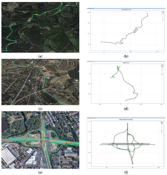 Once the system models have been selected and imported, the test environment and test scenarios are designed and created. In addition to configuring the vehicle, ModelDesk allows creating the test environment, i.e., the road, driving maneuvers and traffic. In particular, the road networks can be created with their characteristics, e.g., lanes, lines and traffic signs, intersections, height, inclination and surface. In our proposed approach, the test scenarios and environmental conditions have been designed to mimic real-world situations. To this end, the road topology of the critical area in our city, i.e., the non-urban stretch between Goslar and Clausthal-Zellerfeld, was taken into account. Beyond that, the most critical weather scenarios affecting the driving behavior were modeled according to the real environmental conditions in this area. In this study, three areas have been modeled to capture different conditions within and between the cities. The first section considered is the route between ISSE and ZOB within the city of Clausthal-Zellerfeld (CLZ). By doing so, the validation process of the system considering the road and environmental characteristics within urban areas is enabled. Some examples of the the situations considered during the modeling are the pedestrians, the traffic lights and traffic with limited speed. The second area covers the non-urban roads, i.e., the road characteristics between the CLZ and the city of Goslar. Due to the fact that the mentioned direction is a mountain road, different road characteristics were considered in terms of road curvature and slope. In addition, the mentioned road has two directions of vehicle traffic. Finally, the third area includes part of the highway and the entrance to the city of Braunschweig. Thus, most of the normal and abnormal conditions have been covered during the environment design phase, i.e., non-urban, within the urban area and on the highway, as shown in Figure 6b,d,f, respectively.