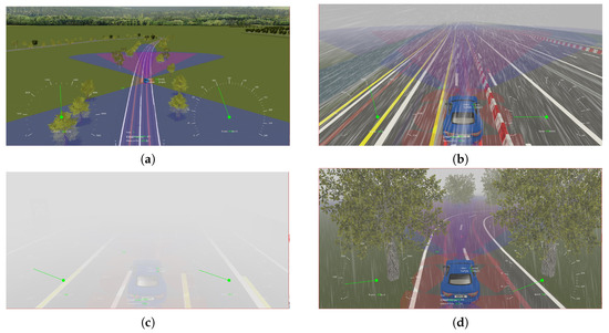 The next phase is to develop the 3D visualization of the testing environment including different weather conditions. To this end, the capabilities of the MotionDesk tool have been employed. Four environmental conditions were considered, i.e., sunny, rainy, snowy and foggy, as shown in Figure 7a–d, respectively. In addition, both day and night vision have been considered in the visualization process. Notably, the blue color in the Figure 7 represents the area of sensor scanning.