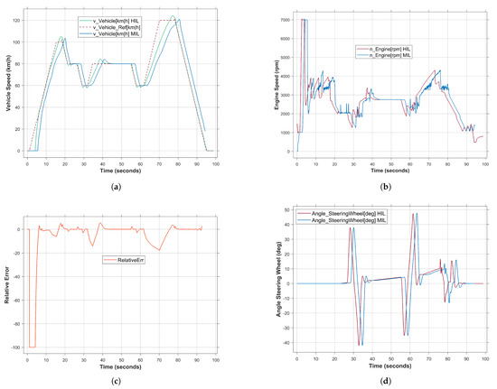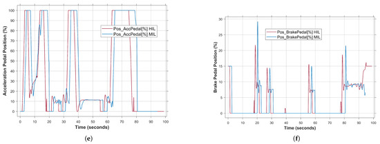As a comparison between MIL and HIL results, Figure 8d–f show the behavior of the driving elements, i.e., the angle of the steering wheel, the position of the accelerator pedal and the position of the brake pedal. It can be observed that both simulation results show similar behavior, with the exception that the HIL system is able to show a more accurate behavior with less fluctuations, especially in the case of driving between 20 and 62 s (Figure 8e). Similarly, Figure 8f shows the status of the brake pedal with accurate response to the control command during the driving time. It can be concluded that using the HIL system as a platform to perform the virtual test drive has high accuracy and lower relative errors compared to non-real-time simulation methods.