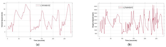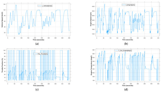 The consideration of abnormal road conditions in the driving environment, e.g., mountain roads with steep slopes and curves, plays an important role in the analysis of the system behavior in critical situations, especially for safety-critical systems. Therefore, in this study, the characteristics of the non-urban road between Goslar and Clausthal city have been modeled so that the unexpected faults and unobserved problems can be detected. Figure 9 shows the vehicle system behavior during a virtual test drive performed manually by the user in the real-time for 450 s. Specifically, the recorded system variables, i.e., vehicle speed, engine speed, throttle position and engine temperature are shown in Figure 9a–d, respectively. The above scenario was performed under fault-free conditions. As can be observed, the more curves in the road, the more the system’s dynamic behavior changes. Due to the mentioned conditions, the vehicle speed changes as a multi-mode behavior between 20 and 100 km/h without being able to maintain a steady state. Specifically, the vehicle speed decreases significantly from 100 to 40 km/h to tackle and skip turns. The corresponding engine speed, throttle position and engine temperature change frequently depending on the scenario. However, it should be noted that the more complex the system behavior, the more difficult the analysis and fault detection process.