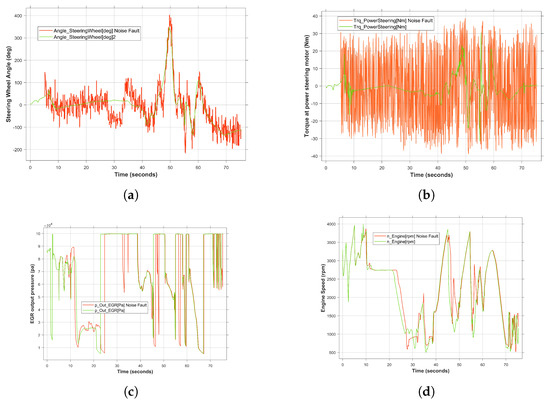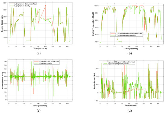 Due to the fact that the occurrence of simultaneous transient faults is more critical than permanent faults, in this study, the effect of two sensor-related faults on the system behavior has been demonstrated. Specifically, gain and noise faults were simultaneously injected into the accelerator pedal sensor and RPM sensor, respectively. Both faults have been activated from 170 to 330 s as shown in Figure 13. Once the faults have been injected, the deviation of the system behavior from the healthy behavior (green curve) can be clearly observed in a red curve. In this case, the mitigation of the concurrent faults by the SUT is considered as a complicating factor. Each fault played an individual role in shaping the erroneous system behavior. This, in turn, caused a temporary cessation in the execution of the intended functionality. Specifically, as shown in Figure 13d, the engine is unable to provide the required torque to the drive system under fault conditions. Similarly, the engine temperature and rail pressure were also affected by the failure, as shown in Figure 13b and Figure 13c, respectively.