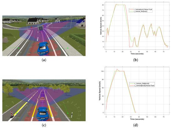 The effect of different road and environmental conditions on FI experiments. (a) Three-dimensional visualization of CLZ driving scenario. (b) Vehicle speed in the occurrence of noise fault. (c) Three-dimensional visualization of Road_Work driving scenario. (d) Vehicle speed behavior under noise fault.