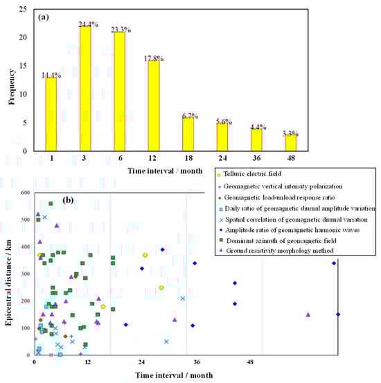 Statistical characteristics of electromagnetic anomalies before M ≥ 5.5 earthquakes in the Gansu–Qinghai–Sichuan area since 2015. (a) Relationship between the frequency of earthquakes and the time interval between the occurrence of the electromagnetic anomaly and the occurrence of the earthquake. (b) The relationship between the epicentral distance and the time interval between the occurrence of the electromagnetic anomaly and the earthquake.