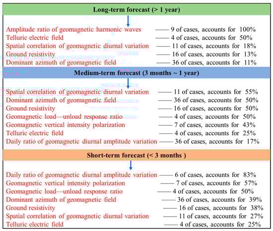 Due to the limited number of earthquake cases, the understanding of the indicators may be insufficient, but with the accumulation of observation data and earthquake cases, the existing forecast indicators will be further improved, and they are expected to provide some reference value in actual earthquake forecast work in the future. It is necessary to pay close attention to the variations in electromagnetic observations in a region, especially short-term anomalies, to provide a powerful criterion for the forecast of these three earthquake elements. It is necessary to pay attention to the commonality and characteristics of different anomalies and summarize long-, medium-, and short-term earthquake forecast methods to improve the timeliness of regional earthquake forecasts.