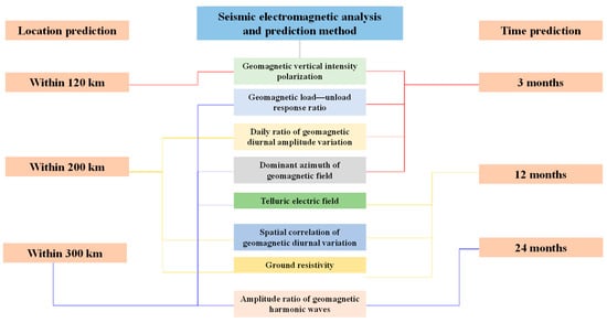 Nine commonly used seismic electromagnetic analysis and forecasting methods have been proposed in recent decades. These methods can be divided into five categories: geoelectric field dominant azimuth methods [], geomagnetic diurnal-variation anomaly analyses [,,], geomagnetic vertical intensity polarization anomalies [,], anomalies of seismic direct current apparent resistivity [,,,,], and geomagnetic depth sounding methods of current apparent resistivity [,].