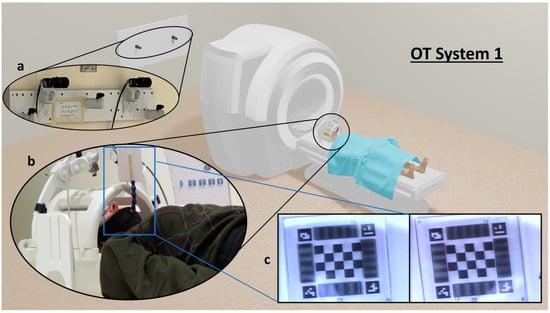 OT System 1. (a) Two cameras are mounted on the rear wall in the magnet room facing the magnet bore. (b) A participant lies in the head coil, who is fitted with a wearable device with a fiducial marker attached. (c) The marker is visible in each camera as displayed in the bottom right. OT = Optical Tracking. This figure includes 3D assets adapted from “Sci-Fi MRI” by Mihail Shegolev (https://skfb.ly/oESMO accessed on 6 May 2024) and “Human” by Aaron Kalvin (https://skfb.ly/6Z8LI accessed on 6 May 2024) licensed under CC BY 4.0.