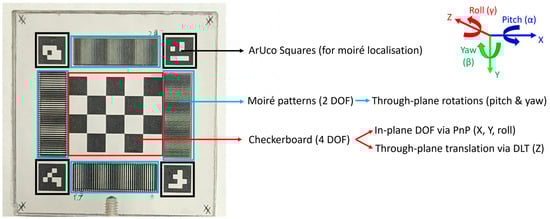 The design features of the fiducial marker are shown in Figure 2, as well as the spatial coordinate system describing all 6 DOF. A central checkerboard was used for tracking the in-plane DOF (translation in X and Y and rotation about Z (roll)) via calculating the solution to the perspective-n-point (PnP) problem [25]. The checkerboard was also used to track the through-plane depth (translation in Z) via the direct linear transform (DLT), which allows for triangulation of the points of the checkerboard in three dimensional (3D) space [26]. Four moiré stripe patterns were placed surrounding the checkerboard for through-plane rotation tracking of pitch (rotation about X) and yaw (rotation about Y). Augmented reality University of Cordoba (ArUco) squares [27,28] were placed in the corners of the marker to assist in localising the moiré regions prior to their analysis. ArUco squares are identified by contour detection algorithms and contain interior patterns, made of black and white squares in a 4 × 4 grid, for encoding an identification number to distinguish each square. This allows not only localisation of the corners of the marker but also the determination of each corner, and therefore the adjacent moiré pattern, uniquely. OpenCV [29] (version 4.6.0), a widely used open-source computer vision library, was used for the PnP and DLT computations (via the functions solvePnP and triangulatePoints, respectively), whereas NumPy [30] (version 1.21.5) and SciPy [31] (version 1.7.3) Python libraries were used for the moiré computations.