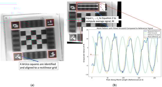 Once the marker was aligned to a known grid, the regions of moiré had a defined pixel position. The four regions were extracted, and lines of grayscale pixel values were collected along the long edge of each region (Figure 3b) to create a set of sinusoidal patterns which were then averaged together, using the equation