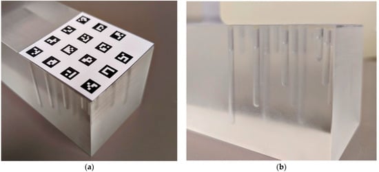Cross-calibration phantom. (a) Camera-visible points using ArUco squares. (b) MRI-visible points as wells filled with copper-II sulfate solution. Camera-visible points are positioned directly above the MRI-visible points with a known difference in depth.