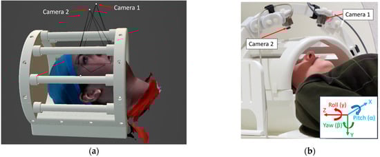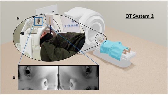 The actual OT System 2 prototype is shown in Figure 6. Two MRI-safe complementary metal-oxide semiconductor (CMOS) video cameras (12M and 12M-I [40], MRC Systems GmbH, Heidelberg, Germany) available in the lab were attached to a 3D-printed arch mount positioned over the head coil to view the head through the coil rungs. Two video cameras were used rather than one, to provide richer information to the neural network by viewing the head at opposing angles. Each video camera had an effective focal length of 6 mm, a FOV of 151 × 112 mm, an image (frame) resolution of 720 × 480 pixels, and a temporal resolution of 30 fps. For the present proof-of-concept work, the arch was placed repeatably in the magnet bore by ensuring that the feet of the mount were equidistant to the end of the patient table. The calibration procedure for these cameras was conducted as outlined for OT System 1 but for each camera individually rather than as a pair, because these cameras were not operated stereoscopically. Each camera was calibrated to obtain estimates of intrinsic parameters only. This was carried out manually at the opening of the magnet bore, without using the wooden calibration stage.