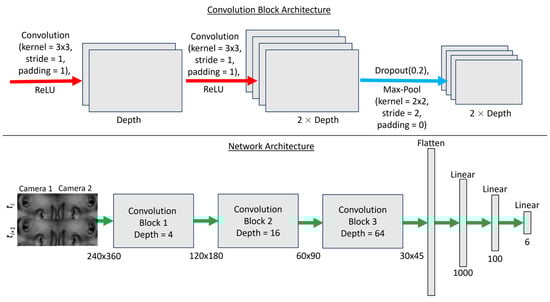 Outline of the simple convolutional neural network for prototype OT System 2. The network architecture is shown on the bottom and the contents of the convolutional blocks are shown on top. Each convolutional block had an increasing depth (4, 16, 64) and contained two convolutional layers (red arrows) (kernel = 3 × 3, stride = 1, padding = 1) with ReLU activation, a 20 % dropout layer, and a max-pool layer (blue arrow) (kernel = 2 × 2, stride = 2, padding = 0). ReLU = Rectified Linear Unit activation.