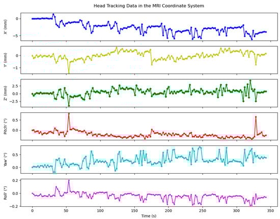 Initial position tracking data of a participant in MRI system coordinates. DOF in the MRI coordinate system are represented as X’, Y’, Z’, Pitch’, Yaw’, and Roll’.